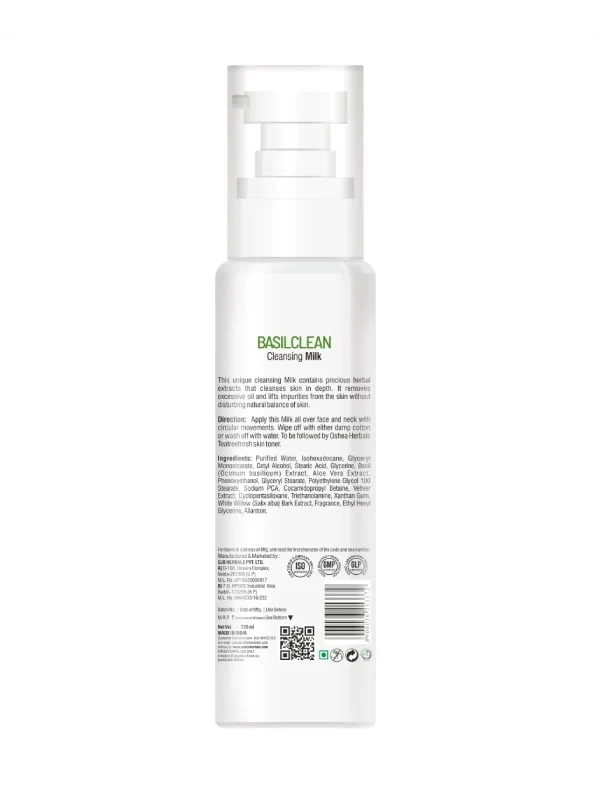 Oshea Herbals Basilclean Cleansing Milk is specially made for normal to oily skin and contains precious herbal extracts that cleanse the skin in depth. It removes excessive oil and lifts impurities from the skin without disturbing the natural balance of the skin. Helps in taking off makeup effectively while deeply cleansing your skin, eliminating excess oil, and purifying it. Its hydrating formula not only leaves your skin feeling refreshed but also ensures it stays well-nourished.