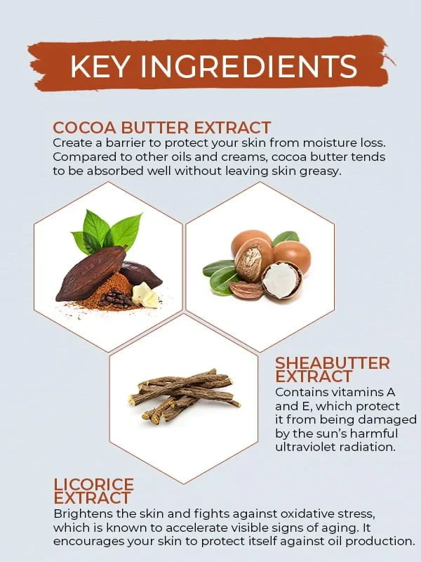 Cocoa butter create a barrier to protect your skin from moisture loss. Compared to other oils and creams, cocoa butter tends to be absorbed well without leaving skin greasy. It improve blood flow of the skin and slow skin aging by protecting against damage from the sun's harmful UV rays.