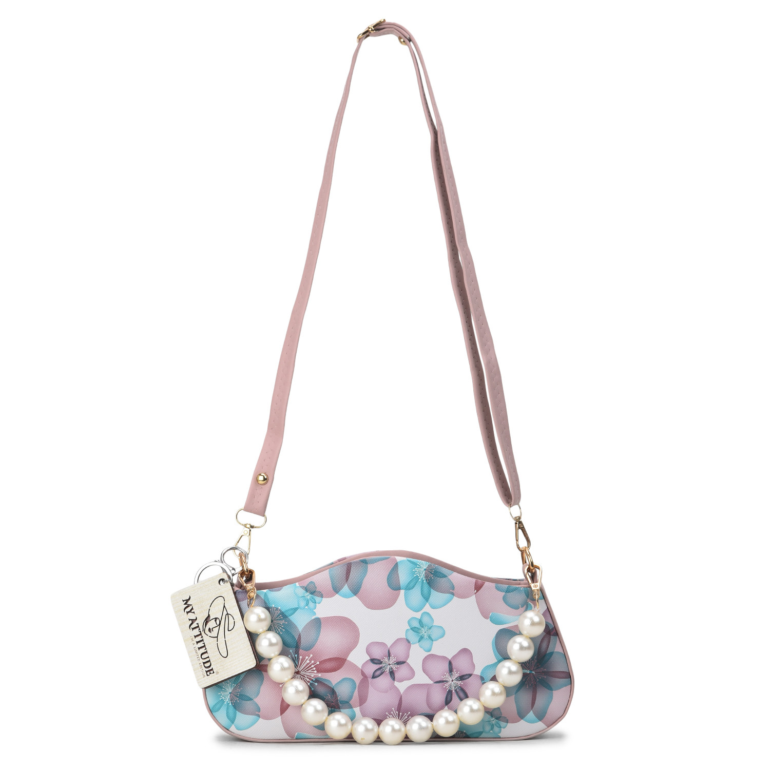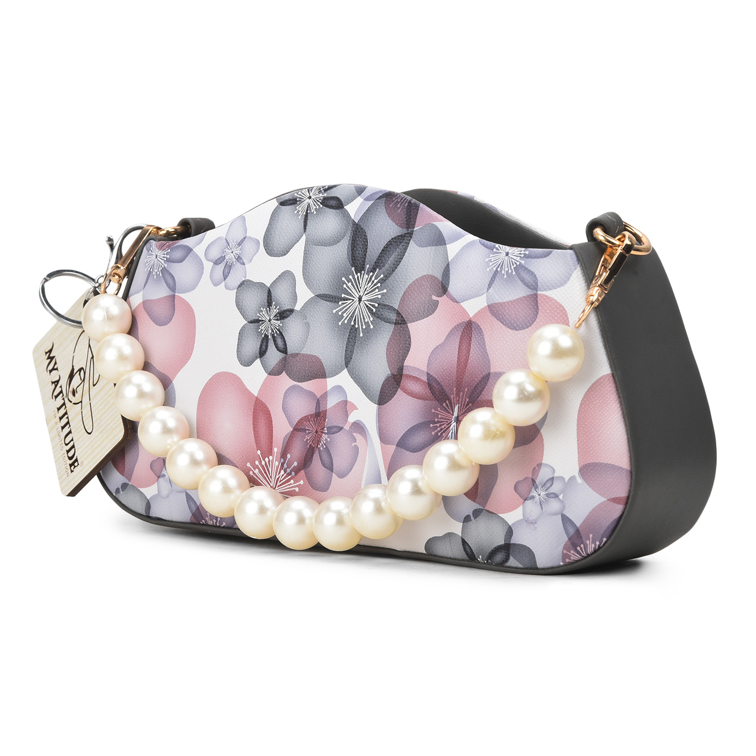 "Floral Pearl Handle Box Sling: Elevate your elegance with this exquisite box sling bag. Adorned with delicate floral patterns and featuring a pearl-studded handle, it's a harmonious blend of sophistication and charm. Whether you're attending a garden soiree or a special evening event, this sling adds a touch of grace while providing practicality with its compact size."