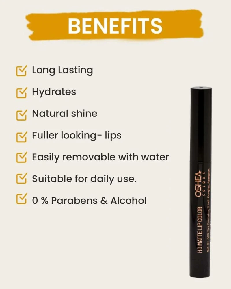 Our HD Matte Lip Color offers vibrant, long-lasting shades that glide on effortlessly, providing a flawless, high-definition finish. The formula ensures rich pigmentation, precise application, and a weightless feel, keeping your lips glamorous and comfortable throughout the day.