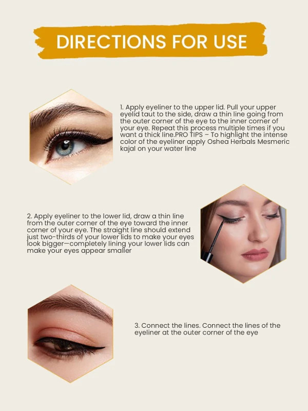 Apply eyeliner to the upper lid. Pull your upper eyelid taut to the side, draw a thin line going from the outer corner of the eye to the inner corner of your eye. Repeat this process multiple times if you want a thick line.PRO TIPS – To highlight the intense color of the eyeliner apply Oshea Herbals Mesmeric kajal on your water line.