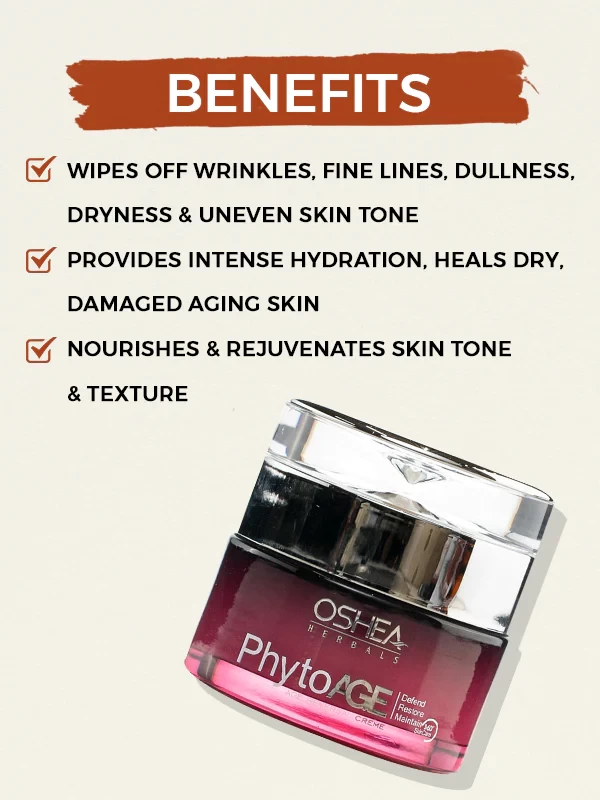 Oshea Herbals Phyto Age Reversal Cream is a unique combination of three key ingredients Paeonia Suffruticosa, Ribes nigrum, and solidago extract which accelerates skin’s surface activity for rapid results on the appearance of fine lines and wrinkles. This anti aging cream adds line-plumping moisture to hydrate, replenish, and rejuvenate the look of the skin. Exclusive sustained action works to continuously renew the look of skin throughout the day. For best results, you can use this cream along with PhytoAge Anti Ageing Serum.
