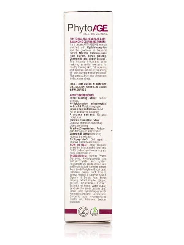 Phytoage Age Reversal Skin Balancing Cleansing Toner features Panax Ginseng Extract. Known for its revitalizing properties, it balances the skin, promoting a refreshed and rejuvenated complexion. Embrace the skin-balancing benefits for a revitalized and nourished toning experience.