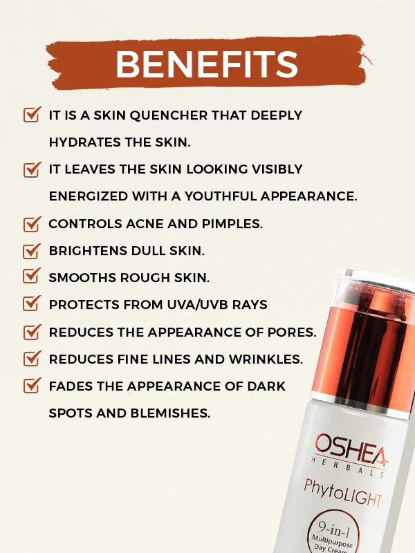 Oshea Herbals Phytolight 9-in-1 Multi-Purpose Day Cream is enriched with skin responsive botanical actives to give immediate and continuous balance to the skin. It lightens & brightens overall skin tone by reducing melanin transfer to the surface of the skin. It is a blend of natural actives and multivitamins provides day long mosturization, lightens skin tone, controls acne & pimple, brightens dull skin, smoothes rough skin, protects from UVA/UVB rays, reduces appearance of pores, reduces fine lines & wrinkles & fades the appeareance of dark spots and blemishes.