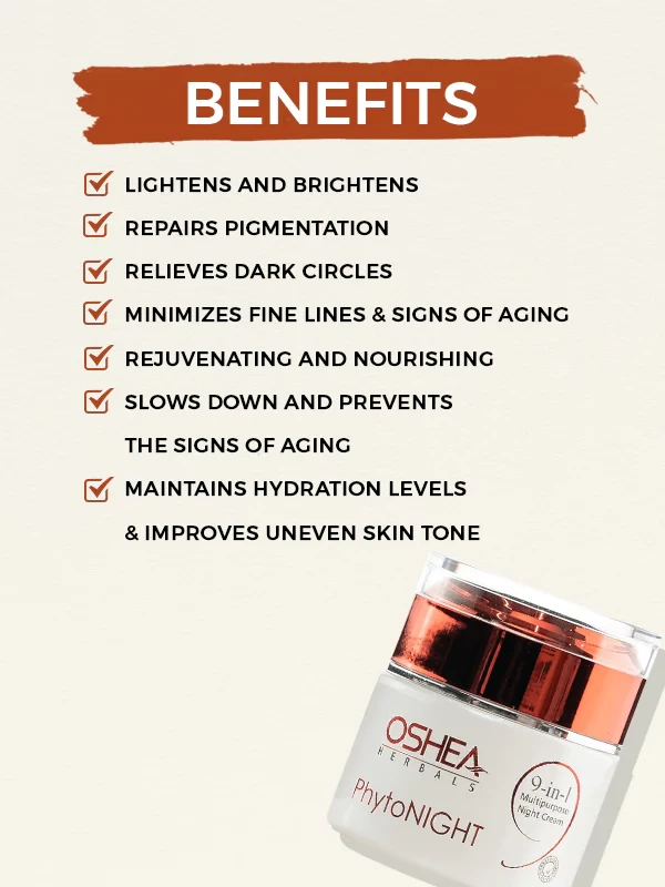 Oshea Herbals Phytonight 9-in-1 Multi-Purpose Night Cream for face is enriched with skin responsive botanical actives to give immediate and continuous balance to the skin. It lightens & brightens overall skin tone by reducing melanin transfer to the surface of the skin. It is a blend of natural actives and multivitamins.The Phytonight night cream for face is the formulation of ingredients like Pea (Pisum sativum) Extract, Soybean (Glycine soja) extract, Pyrus Malus (Apple) Fruit Extract, and Bearberry extract. These ingredients help as a skin brightening and skin smoothening solution. This herbal night cream for women and men helps to firm the skin and makes it a natural emollient and moisturizer. It also helps to delay premature ageing and improve skin texture with the help of apple extract. While this is a night cream, it is preferrable to use it during night. For day care, you can prefer to use Phytolight 9-in-1 Multipurpose Day Cream For Face.