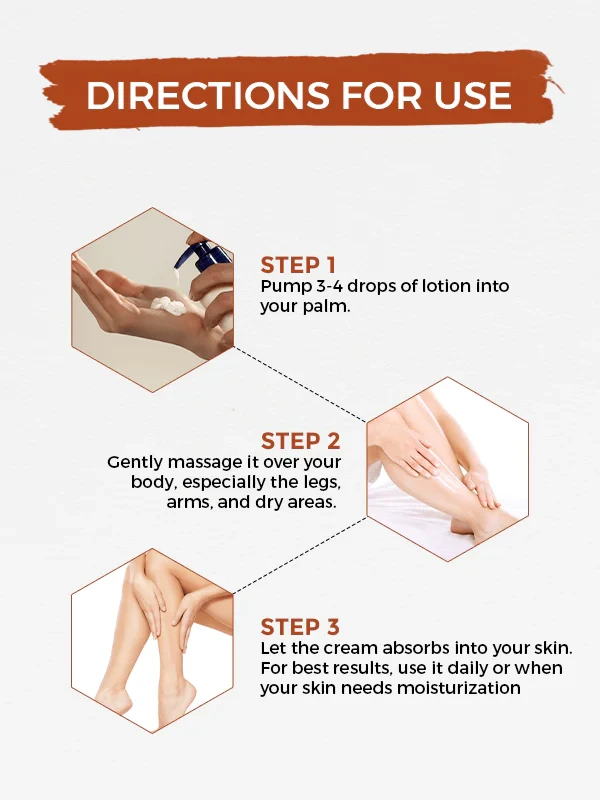 Gently massage it over your body, especially the legs, arms, and dry areas.